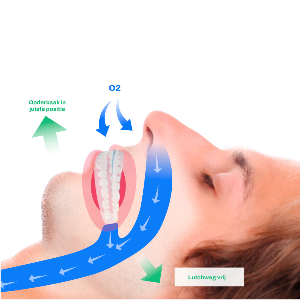 De snurkbeugel op maat fixeert de onderkaak en voorkomt dat de tong naar achteren zakt, waardoor er meer ruimte ontstaat in de neus of keel. Dit type beugel zorgt dat de onderkaak licht naar voren wordt gehouden, wat essentieel is voor het vrij houden van de luchtwegen.