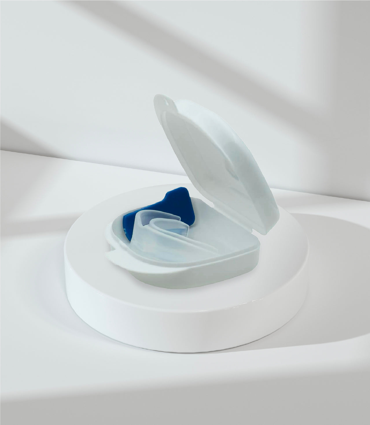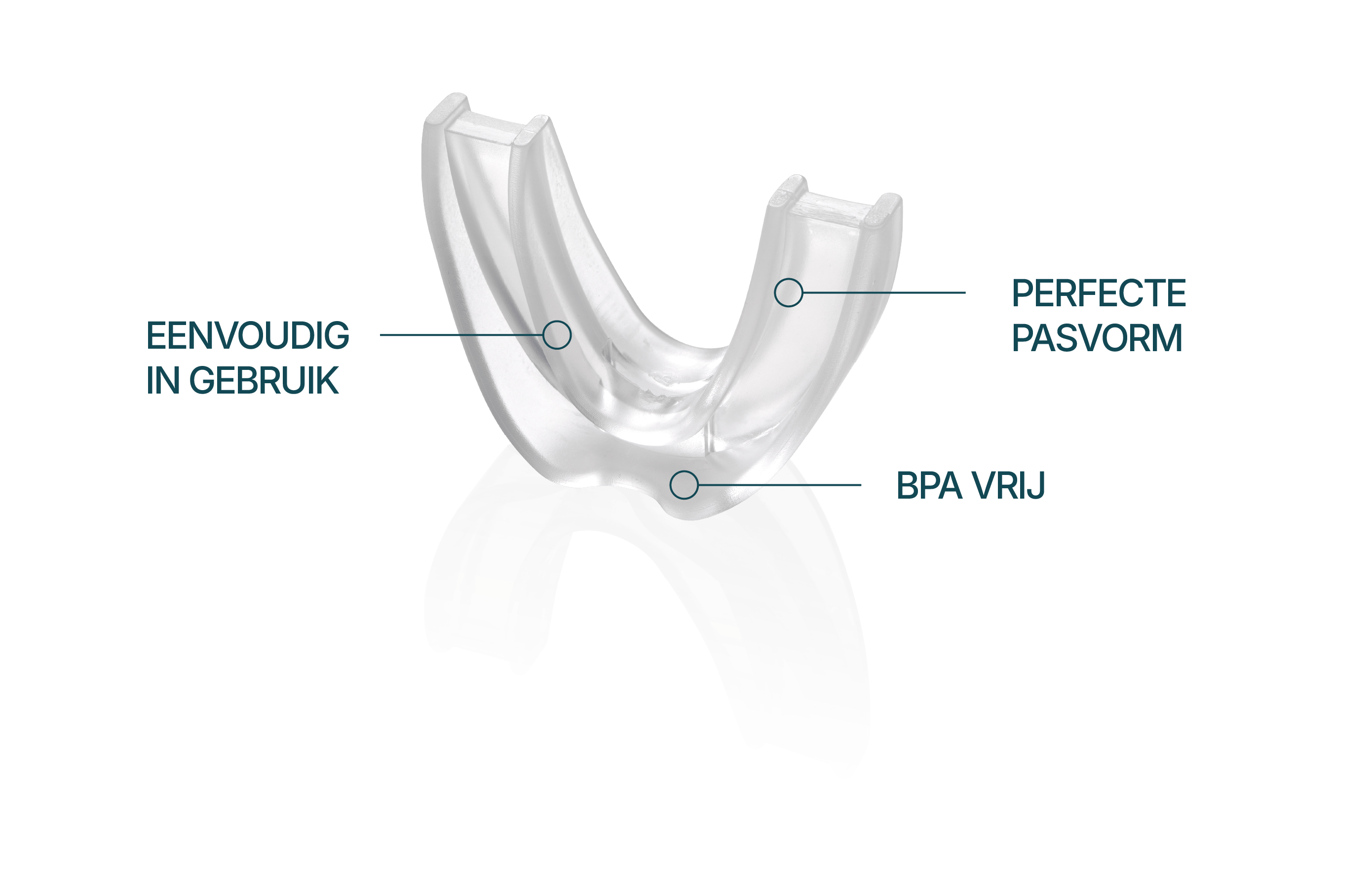 De snurkbeugel op maat fixeert de onderkaak en voorkomt dat de tong naar achteren zakt, waardoor er meer ruimte ontstaat in de neus of keel. Dit type beugel zorgt dat de onderkaak licht naar voren wordt gehouden, wat essentieel is voor het vrij houden van de luchtwegen.